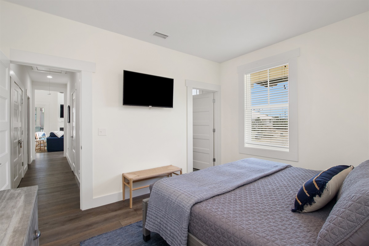- Guest Bedroom: Queen bed with en-suite bath with shower and Smart TV.